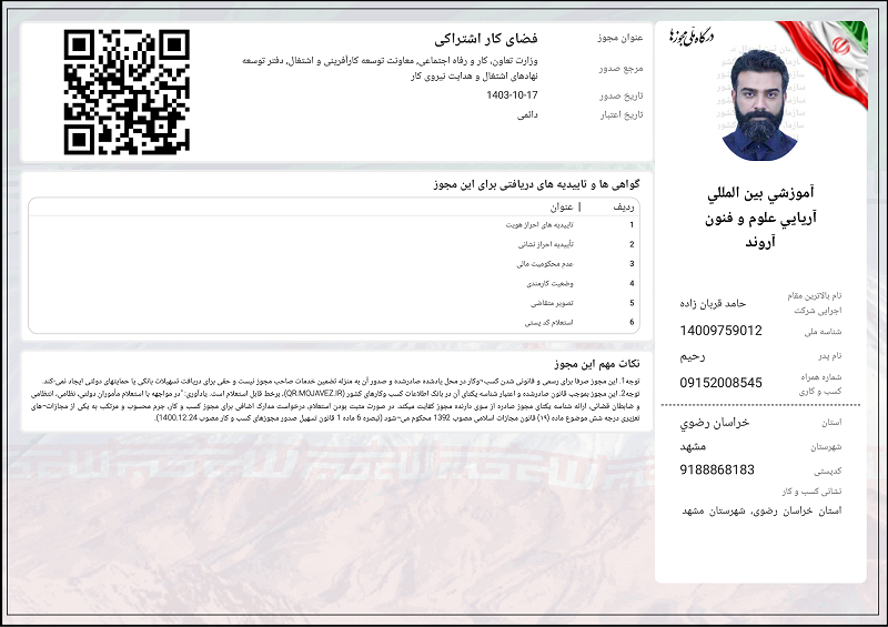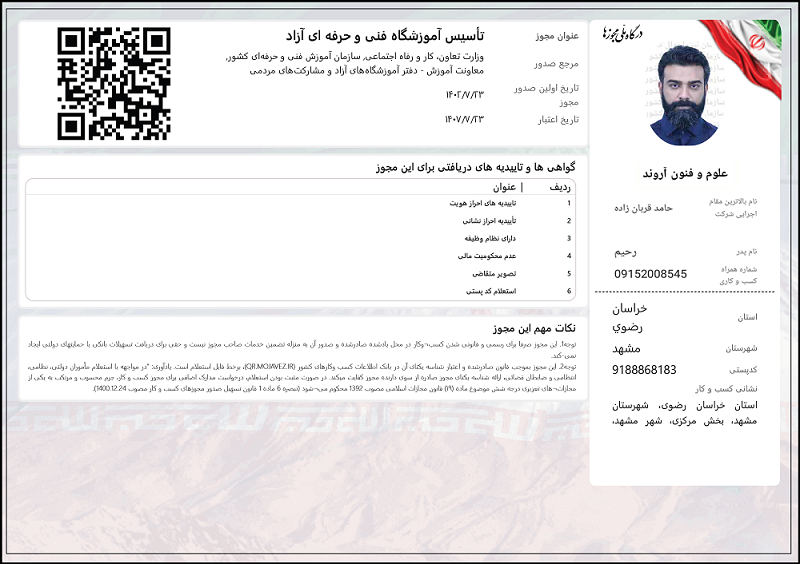• گواهینامه مورد تاييد سازمان آموزش فنی و حرفه ای