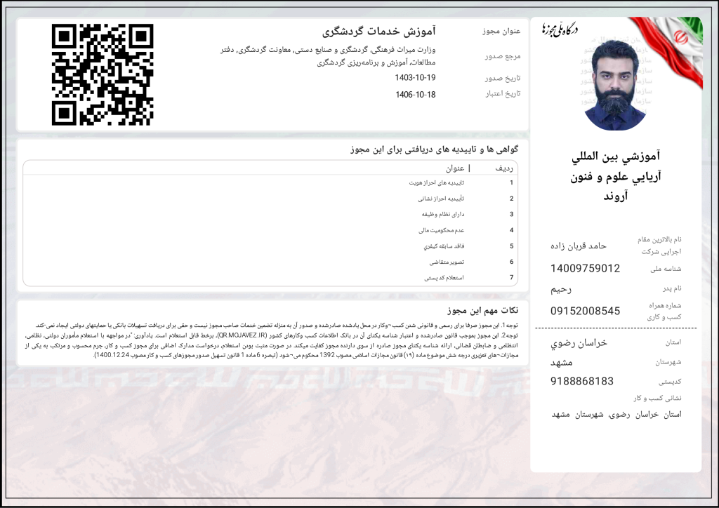 • گواهینامه های مشترک صادره از سازمان میراث فرهنگی، گردشگری و صنایع دستی